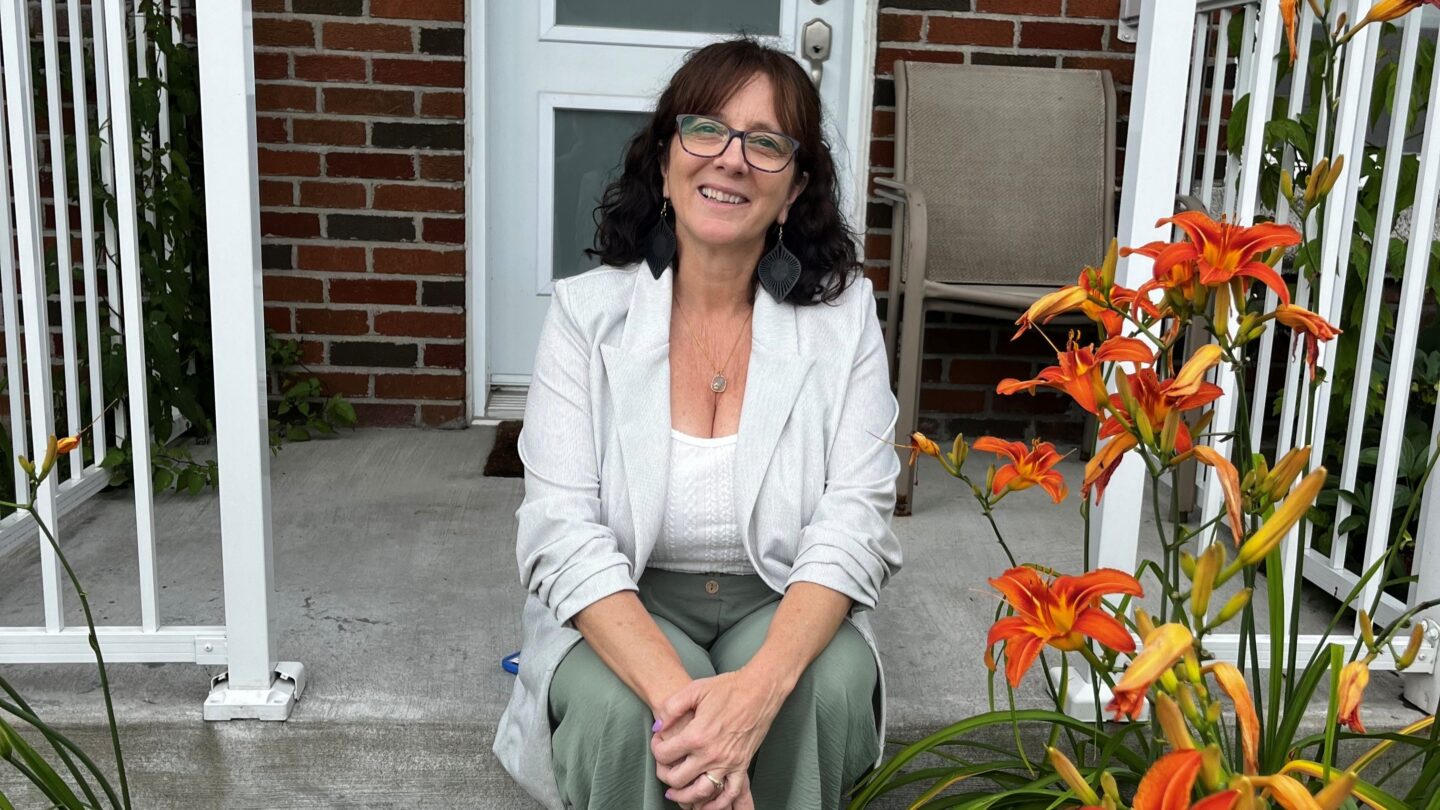 Suzy Lampron pose dans les marches de leur nouveau local. Photo gracieuseté