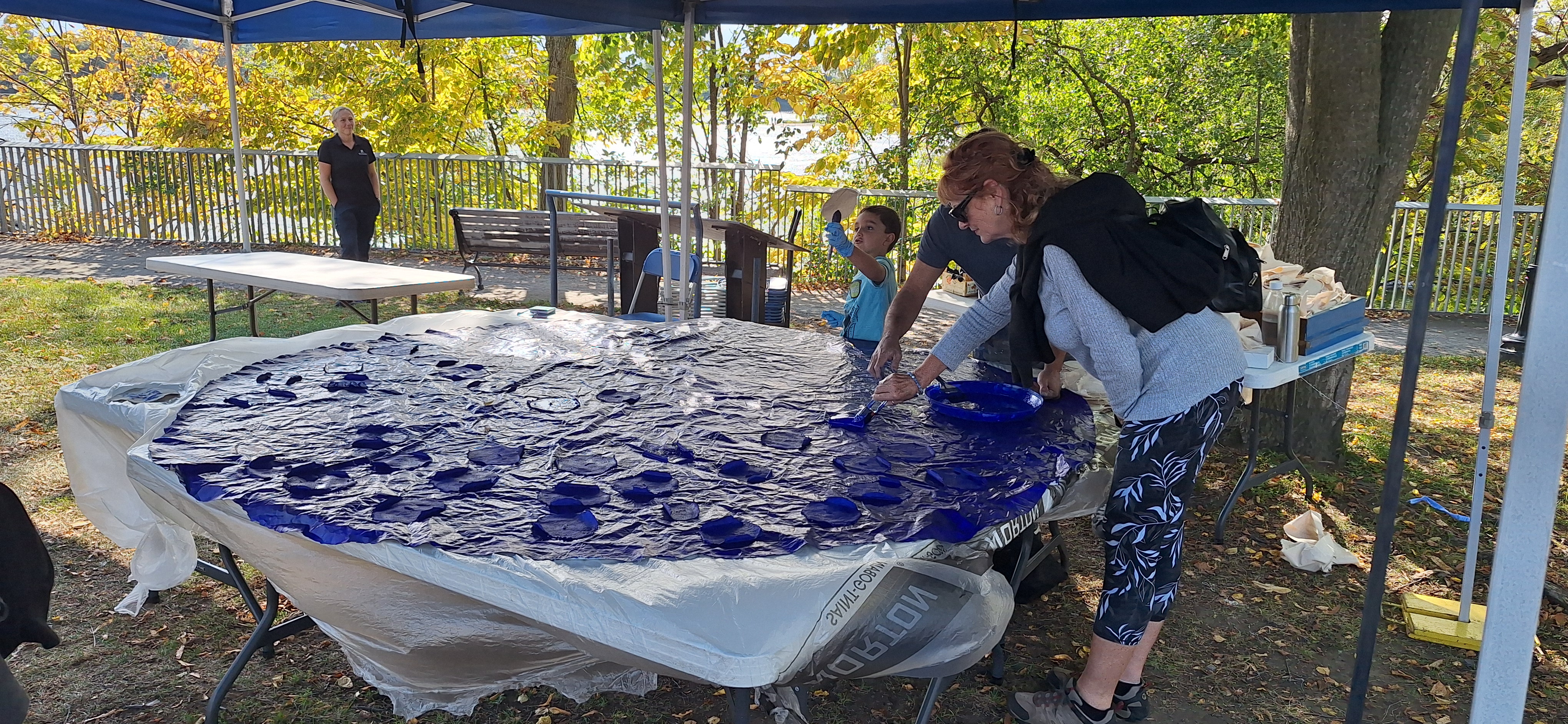 Installé devant la bibliothèque de l’île des Moulins, l’artiste avait préparé une grande toile en lin sur laquelle les passants qui le voulaient pouvaient peindre un cercle de toile avec une peinture bleue faite maison. Ce cercle de peinture allait ensuite laisser son empreinte sur la toile, mais une fois sec, François-René ajoute les ronds de toile sur une colonne en fer. Au fil de l’atelier, les participants ont aussi pu voir le peintre fabriquer en direct sa propre peinture avec du pigment, de l’eau et du solvant acrylique.