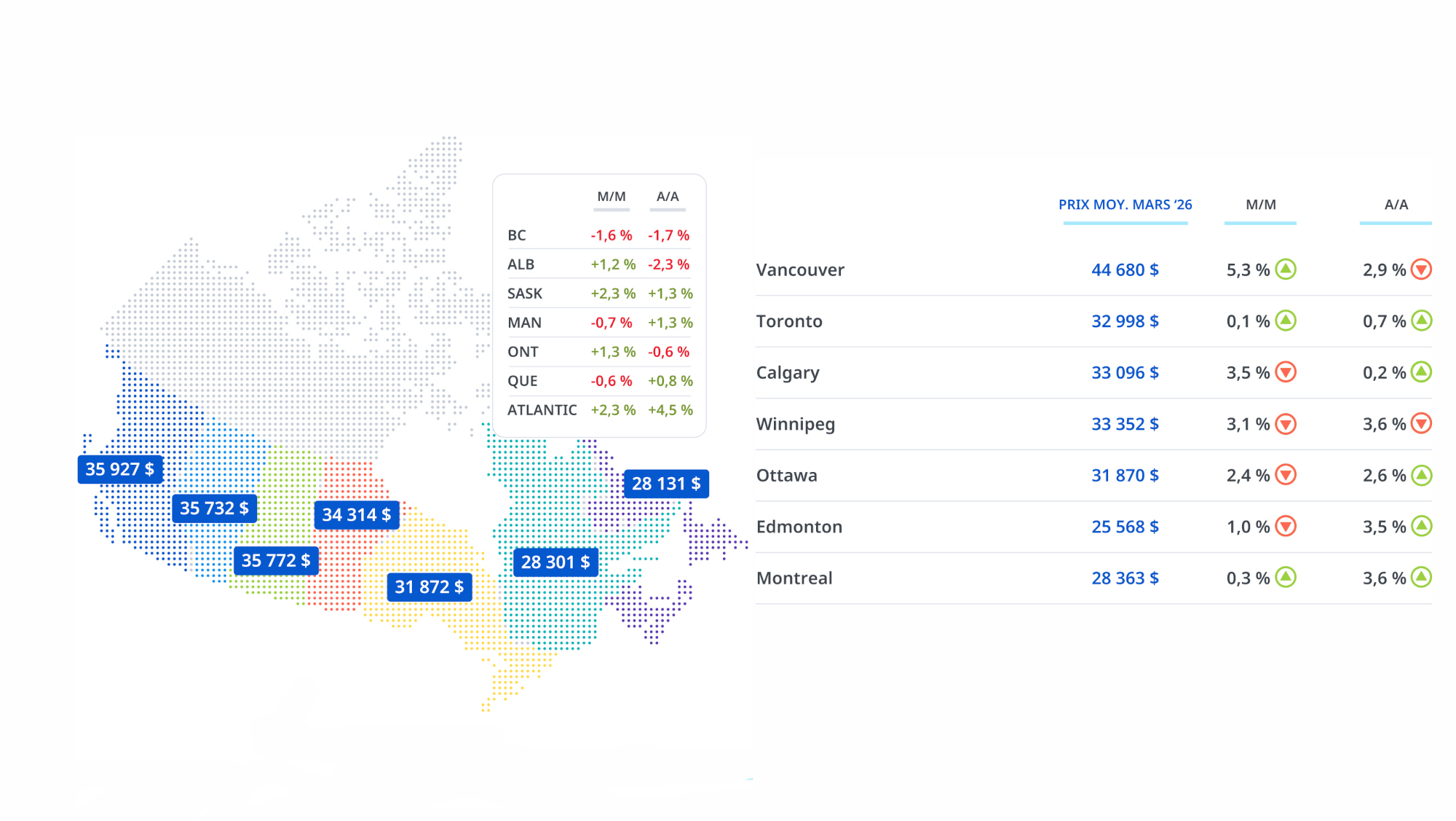 Les disparités régionales se maintiennent. Les provinces de l’Ouest affichent les prix moyens les plus élevés, en raison notamment d’une forte demande pour les camions et les VUS ainsi que d’un coût de la vie plus important.
