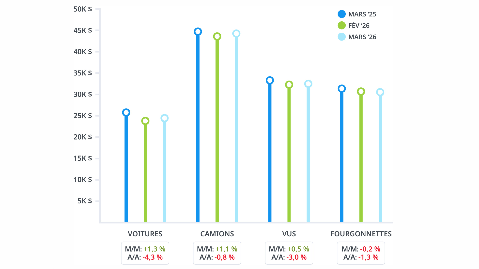 Selon l’analyse trimestrielle, la hausse des prix de l’occasion semble vouloir se stabiliser. Après une baisse marquée tout au long de l’automne dernier, nous avons connu une hausse importante dès le début de 2025. En mars 2026, le prix de vente moyen d’un véhicule d’occasion au Canada s’est établi à 31 907 $, en légère hausse de 0,5 % par rapport à février. Cela demeure toutefois inférieur de 2,3 % par rapport à mars 2025. Mars confirme donc un certain ralentissement de la pression sur les prix.