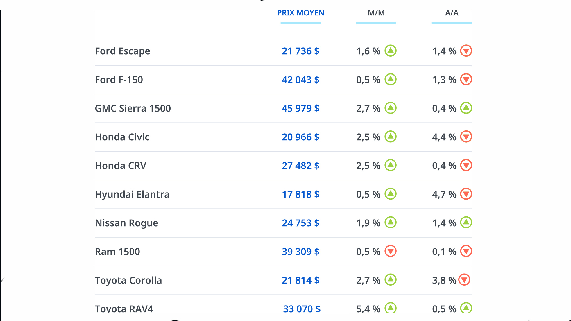 Les VUS les plus populaires sont les Ford EscapeNissan RogueToyota RAV4Honda CR-V alors que les Ford F-150GMC Sierra 1500 et Ram 1500 dominent chez les camionnettes.